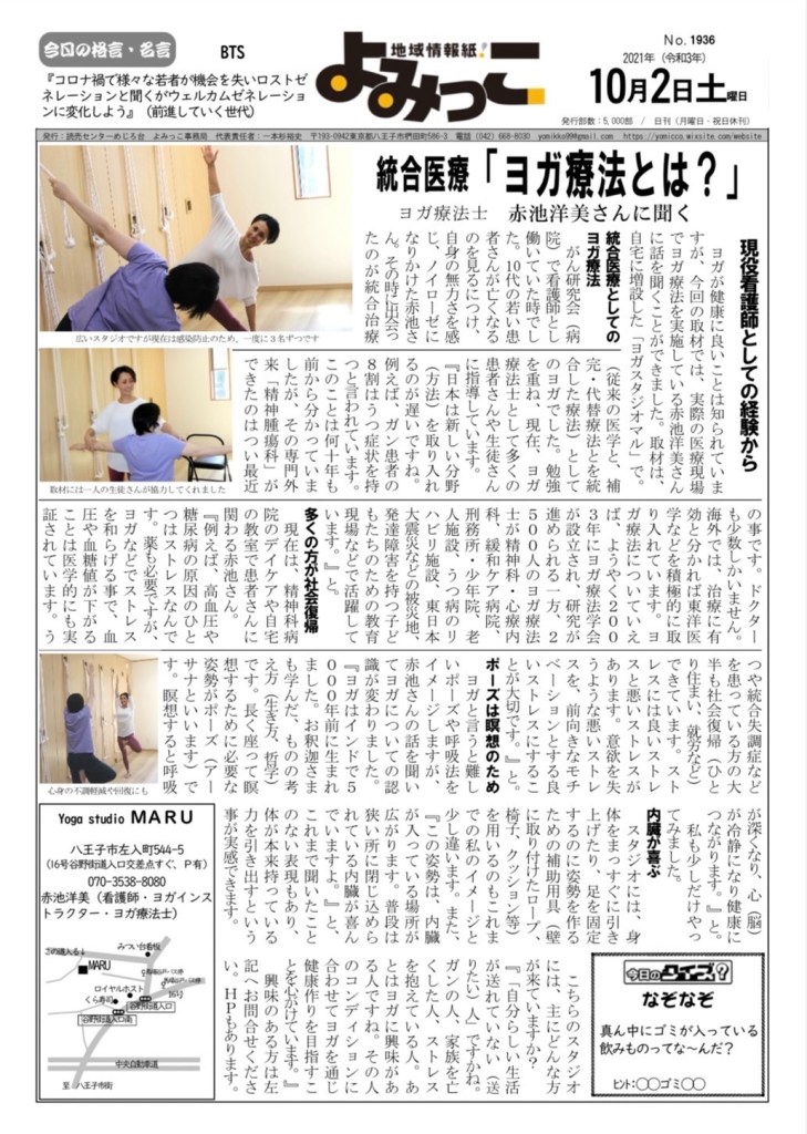 こんにちは。統合医療「ヨガ療法とは?」ヨガ療法士 赤池洋美さんに聞くというタイトルで、現役看護師としての経験からのヨガのお話を掲載させていただきました。